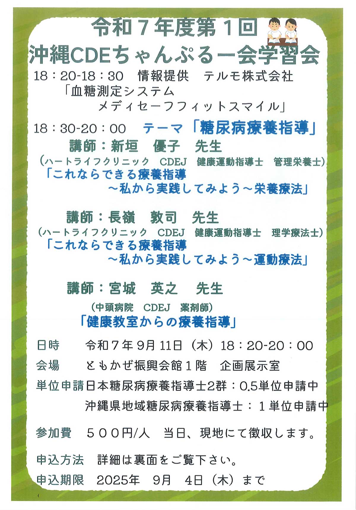日本糖尿病療養指導士 認定更新のための単位が取得可能な講習会 沖縄CDE会L認定更新のための単位が取得可能な講習会 2025.08.06 令和7年度第1回沖縄CDEちゃんぷるー会学習会 前の投稿一覧へ次の投稿